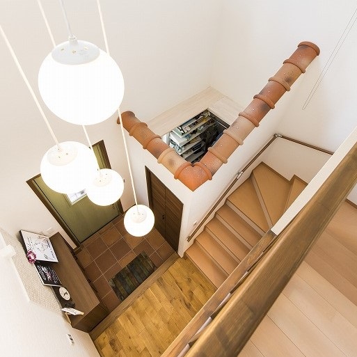 玄関の吹き抜けです。窓からの光で明るく、シューズクローク上の瓦など遊び心がある造りになりました。あと、リビングの天井を高くしたので、より広く感じます。僕たちが思い描いていたとおりの家を建てることができ、セルビーさんにお願いしてとても満足しています。